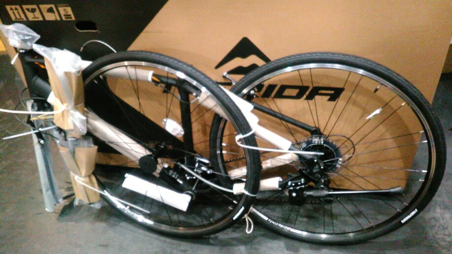 後輪は取り付けられていますが、前輪やハンドル、サドル、ペダル等は外されたままで梱包されて来ます。